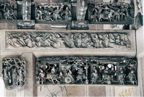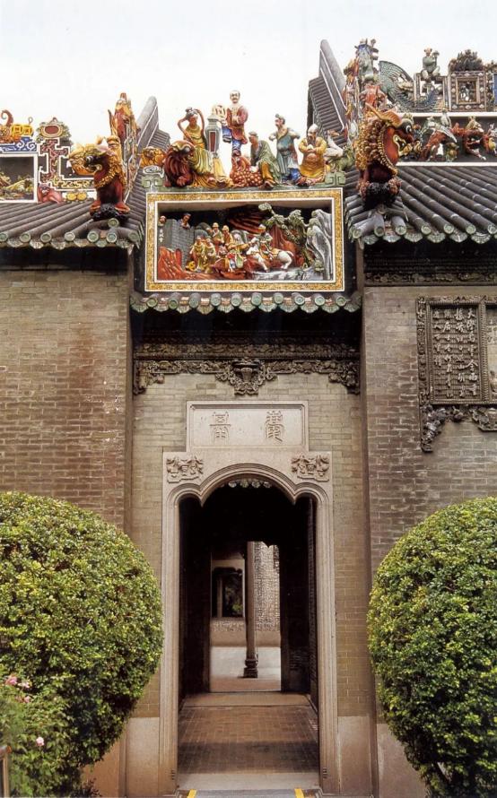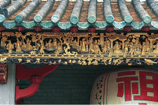 岭南砖雕有纤巧、玲珑、精细如丝的工艺特点,习惯称之为“挂线砖雕”。有广州陈家祠大型砖雕可证。灰塑是用石灰、麻丝、纸浆和铁丝等堆塑而成,它制作自如,可塑性大,常用在脊饰和檐下,也可塑成翼角,多为鳌头、走兽等立体造型。陶塑瓦脊是指用泥塑好的形象经过窑火煅烧而成的建筑饰件,它不怕风雨,久保色泽,以佛山石湾陶塑最为知。